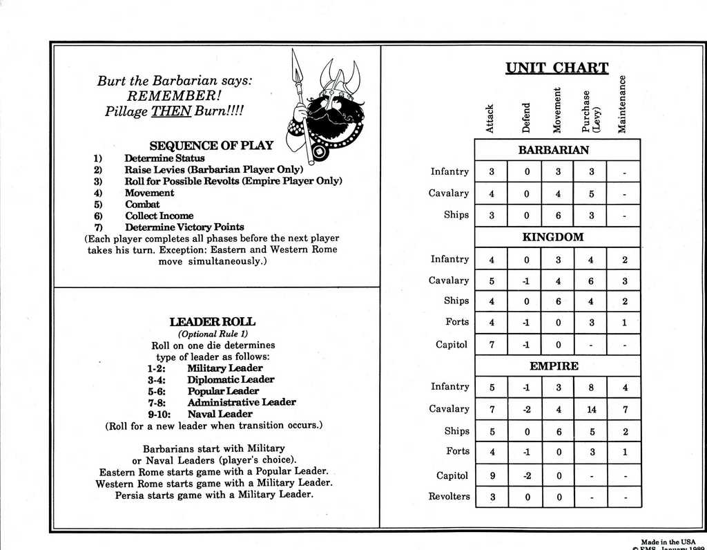 RISE and FALL is a game for one to six players. It portrays the last days of the Roman Empire when internal revolts weakened Rome from the inside and barbarian hordes invaded her border areas. Players control the Eastern or Western Roman Empire, the Persian Kingdom, or one of the numerous barbarian nations. When barbarians become strong enough, they form kingdoms, and kingdoms evolve into empires that have all the problems of Rome! Note that a player is never eliminated! If a player's country is conquered, he can return to the game as a new barbarian group, and seek revenge against the player who got him!!