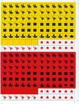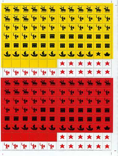 There are 576 counters. They are printed on one side only. There are six identical sets of player counters (black on white/red/blue/yellow/green and white on black) with icons of a swordsman, a cavalryman, a tower, and a galley. Each set consists of: 25 infantry |